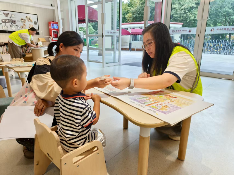 活动伊始,家长带宝宝签到后,领取并填写专属成长档案,详细记录宝宝现阶段发展情况,宝宝们在老师的耐心鼓励下,有序接受身高、体重测量。9:00 起,室内外分散性亲子活动同步开启。室内设亲子阅读、故事聆听、神秘摸箱等9个游戏,老师指导家长以“提问式讲述”“角色模仿”引导宝宝感受绘本故事,或协助宝宝用词汇表达摸箱中物品的触感与形状;户外“摘果子”“草帽寻宝”游戏中,志愿者老师引导宝宝在情境中说说水果、玩具的名称和颜色,让孩子在玩中学、学中说,逐渐克服语言表达的胆怯,主动开口表达。10:00小集体活动“毛毛虫”按时开展。执教老师播放自编儿歌《可爱毛毛虫》,引导宝宝跟着哼唱;通过“小丝巾变变变”简单呈现毛毛虫变蝴蝶的过程,让宝宝在家长陪伴下模仿。活动中,老师还结合实例讲解 0-3 岁宝宝语言发展特点,分享家庭互动技巧,助力家长将早教理念融入日常。