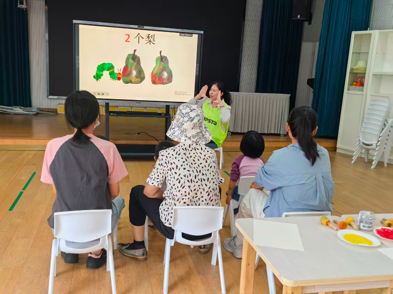 在集中性亲子活动 “毛毛虫”中,志愿者老师以绘本《好饿的毛毛虫》为导入,示范海绵棒印画技巧。宝宝们手持海绵棒蘸取颜料,在白纸上印出圆形 “食物”,家长们则用生动语言引导孩子创作,并协助宝宝贴上道具眼睛,一个个鲜活的毛毛虫作品应运而生,现场充满欢声笑语。