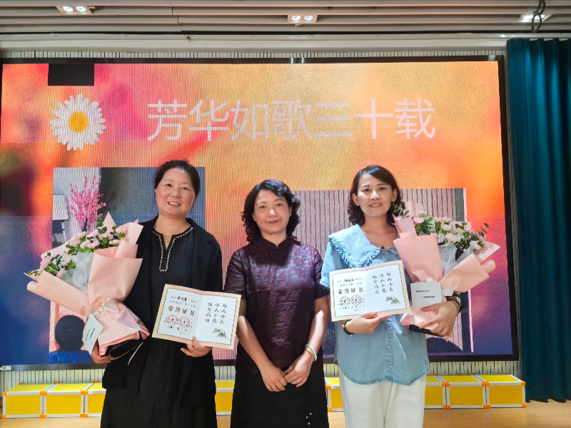 活动特设“致敬30年匠心守初心”环节,为从教30年的副园长李月芳、教学办主任张亚红献花颁奖。厉建芳书记回顾两位教师扎根班级15年、服务管理15年的经历,两位教师分享教育故事,传递坚守初心的育人精神。