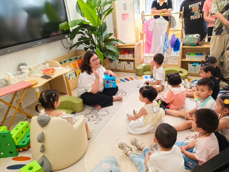 宝贝们的进步,成了家长眼中最暖心的画面。原本害羞不敢说话的孩子,在老师用小熊手偶引导后,慢慢说出自己的名字;吃点心时,能学着自主挑选、说“谢谢”;最后和家长一起给小床、衣物架贴大头贴时,还会骄傲地指给家长看“这是我的”。托班宝贝跟着老师做拍手律动、认班级区域时,眼里的好奇与欢喜,让家长们悄悄放下了心。
